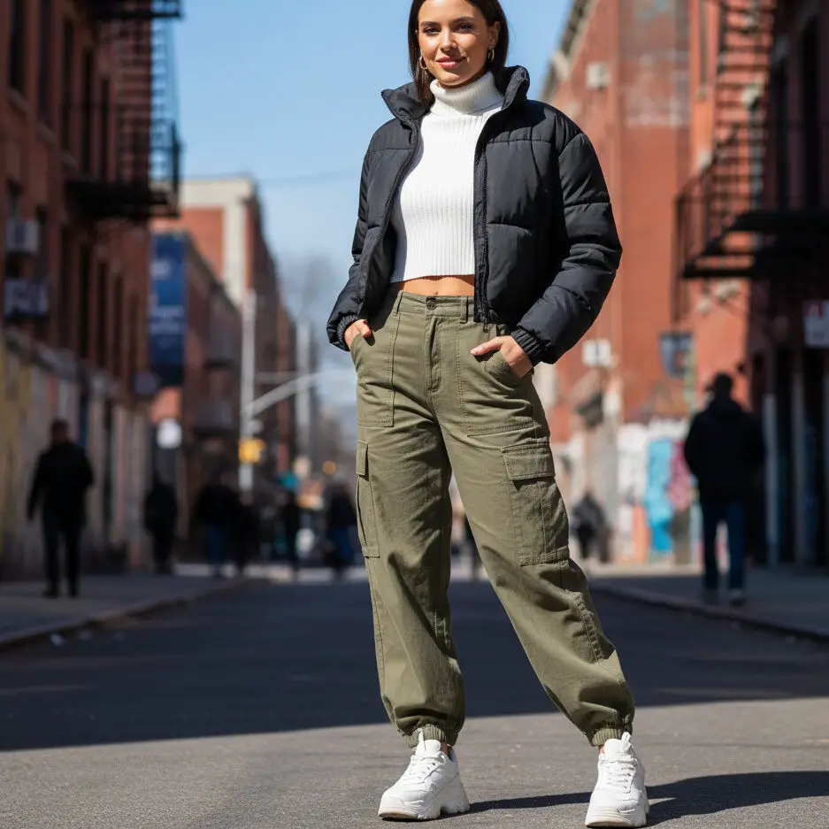 Try turtleneck outfit layering with a cropped puffer over your white knit and wide-leg cargos. Add chunky trainers for a relaxed yet trendy silhouette.