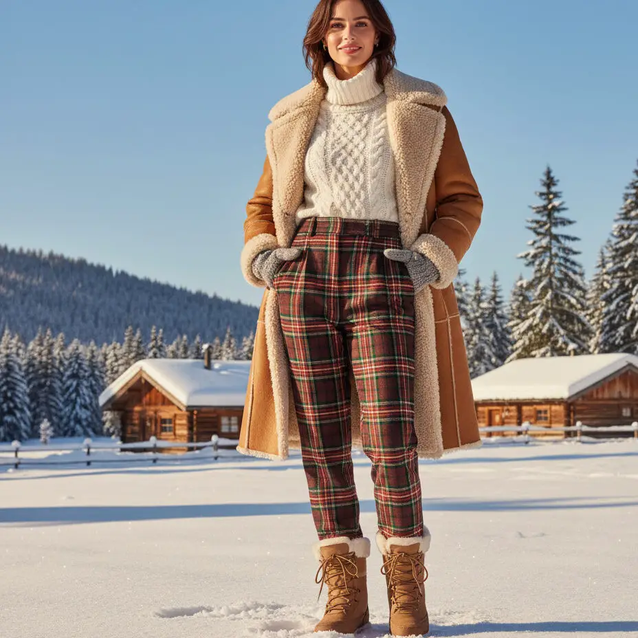 Pair your white turtleneck sweater with plaid trousers and fur-lined boots. Add a shearling coat and knit gloves for fireside comfort with a stylish twist.