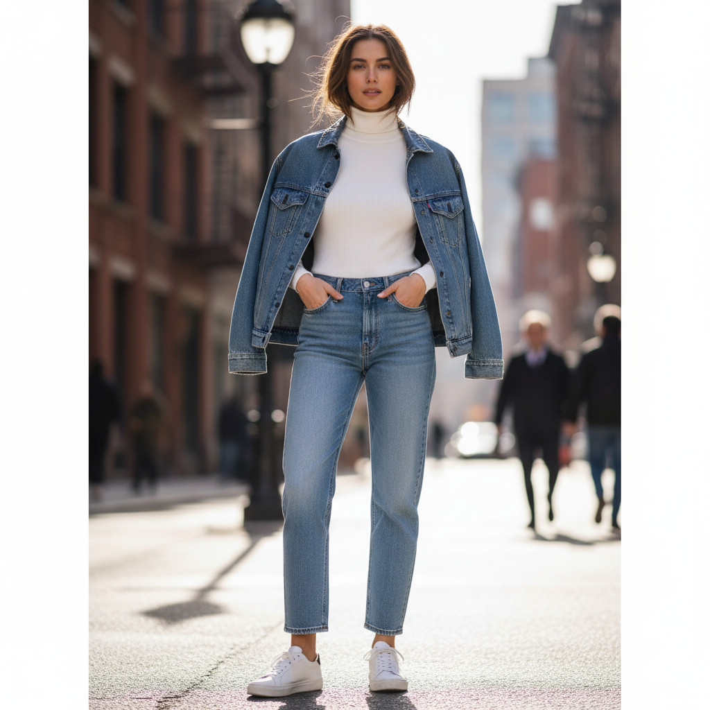 Tuck your turtleneck top outfit into high-rise straight jeans and add an oversized denim jacket. Finish with loafers or sneakers—a timeless cool-girl favorite.