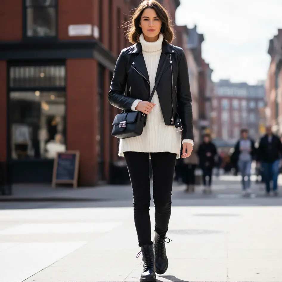 Layer a chunky white turtle neck outfit under a leather jacket with black jeans and combat boots. Add a crossbody bag for a casual yet confident urban look.