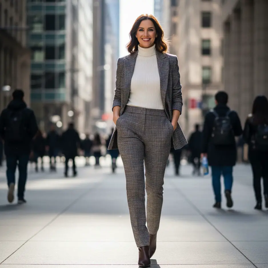 Layer a white turtleneck under a checkered blazer with tailored pants. Add heeled boots and minimal jewelry. It’s polished, comfortable, and ideal for smart winter dressing.