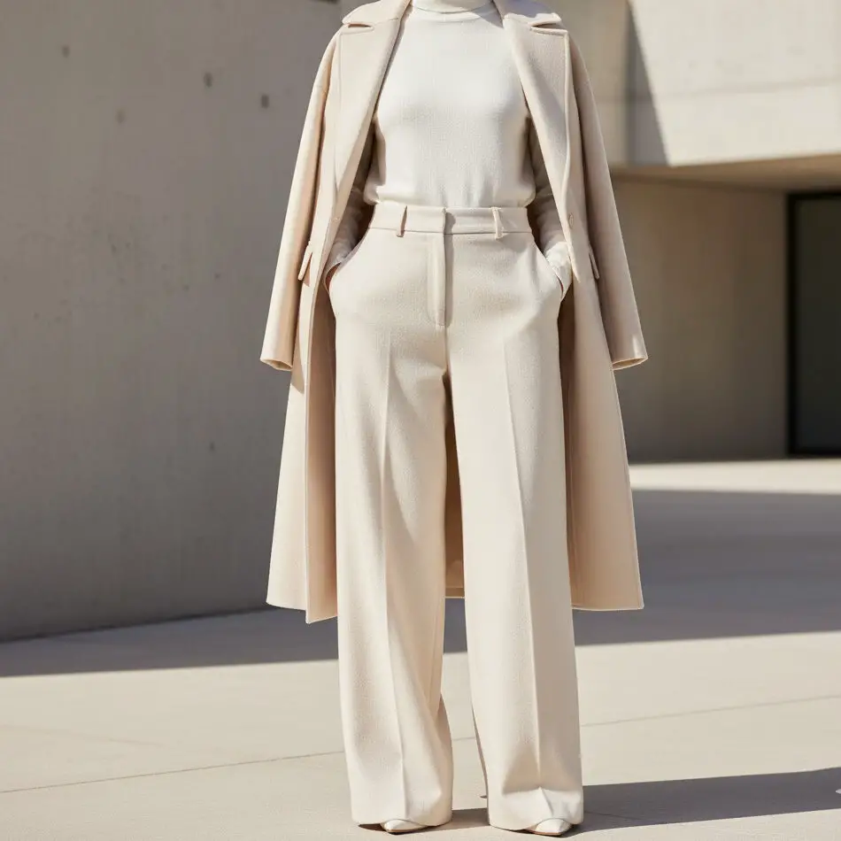 Go full neutral with a cream turtleneck outfit, beige trousers, and suede loafers. Add a long wool coat for a soft, tonal winter aesthetic that feels rich yet relaxed.