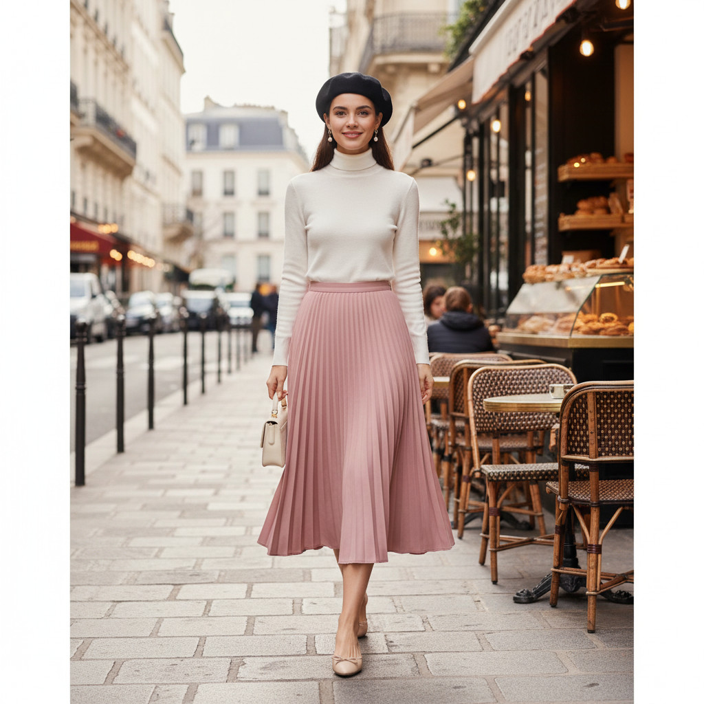 Tuck a slim turtleneck top outfit into a pleated midi skirt. Finish with ballet flats, a beret, and delicate earrings. This feminine winter edit feels straight out of a Paris café scene.
