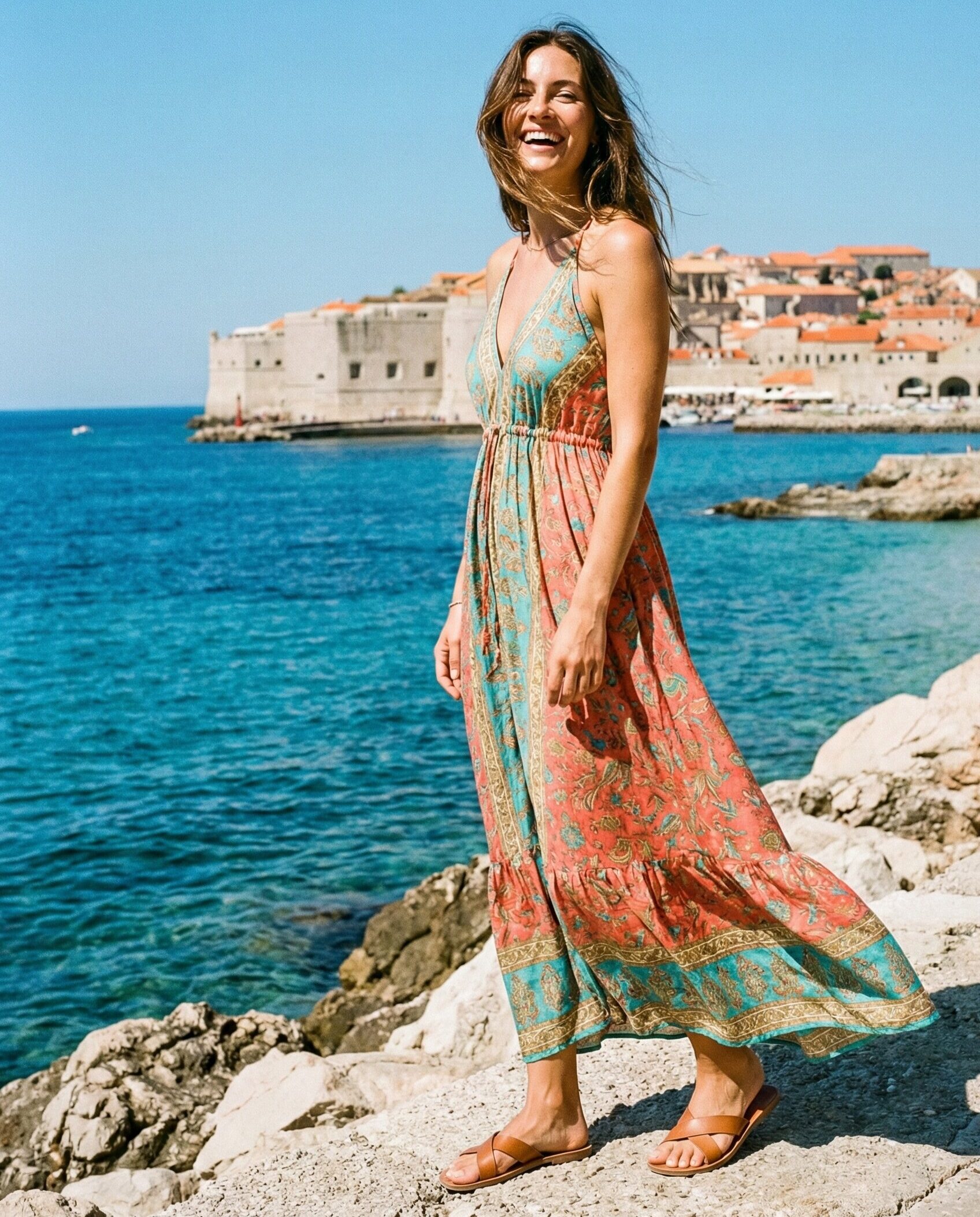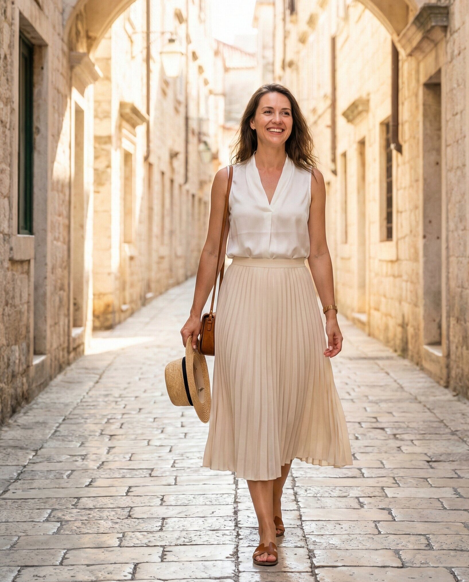 A midi sundress captures the romantic feel of Croatia’s cobblestone streets. Choose soft cotton or chiffon for comfort in the heat. Add a straw hat and woven bag for a chic, sun-protected outfit perfect for sightseeing and café stops.