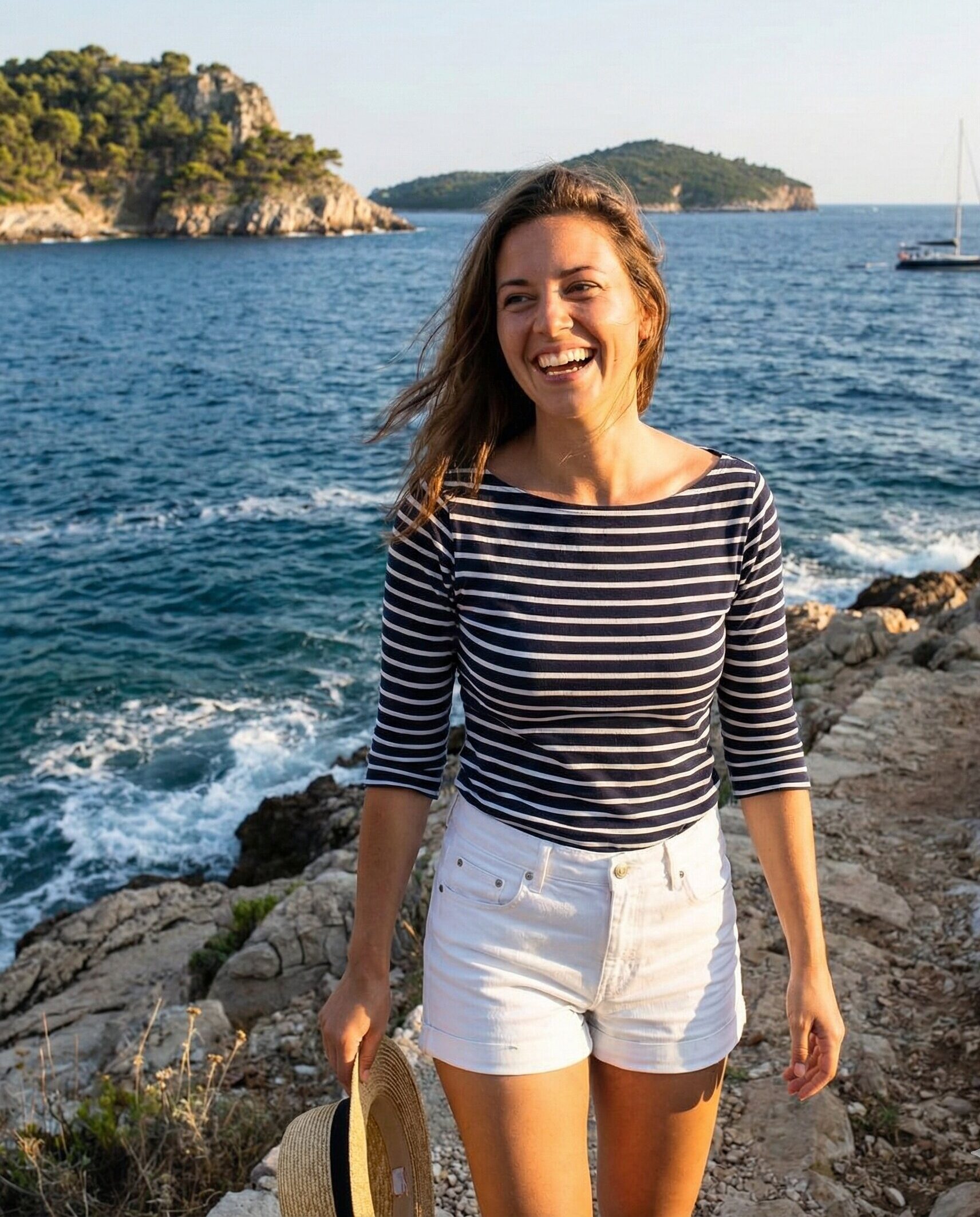 A striped top channels effortless nautical style along the Adriatic coast. Combined with white shorts, this outfit feels crisp and summer-ready. Finish the look with sneakers or sandals for comfortable sightseeing days.