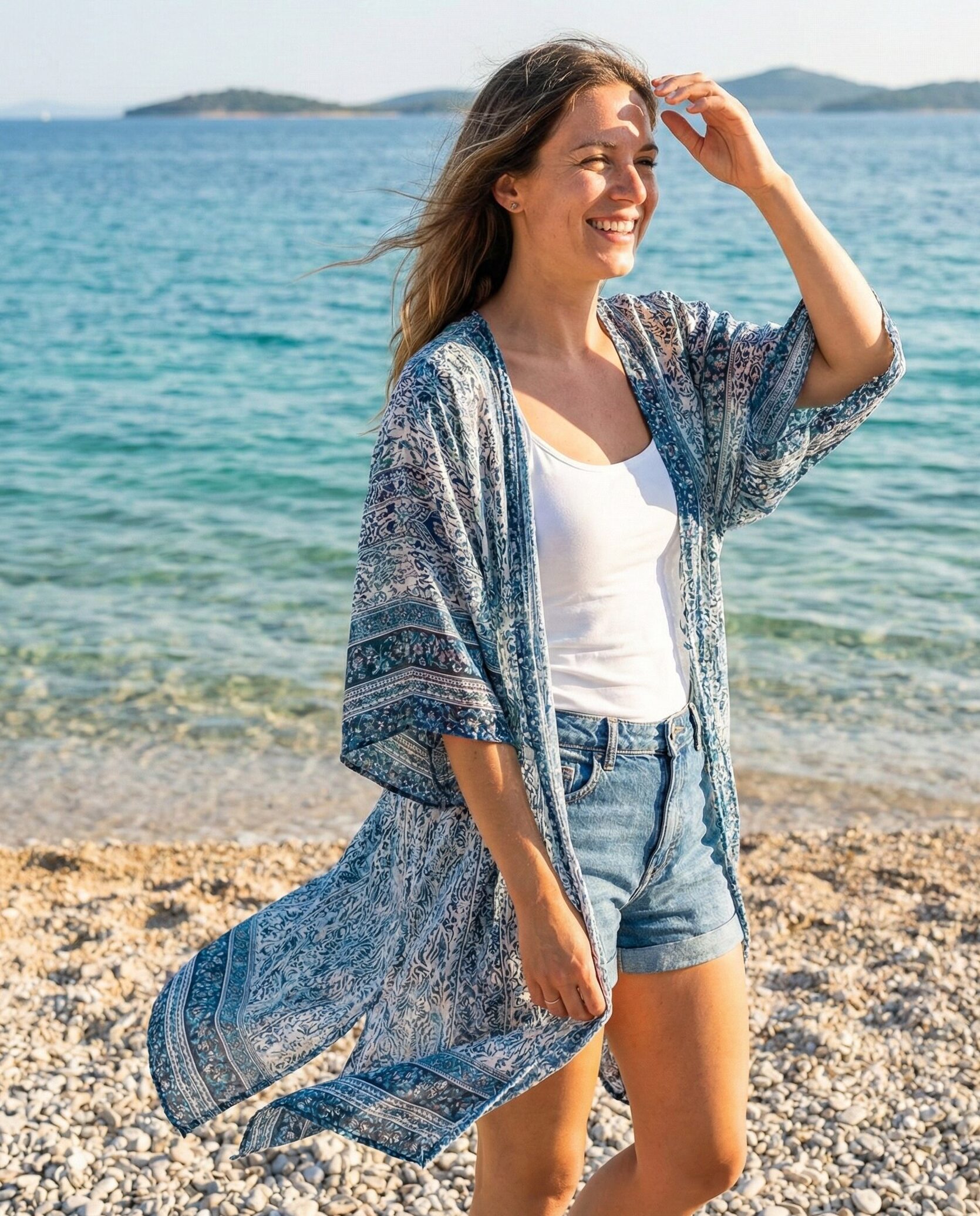 Layer a lightweight kimono over a tank and shorts for a stylish beach-town vibe. The kimono adds movement and color while keeping your outfit breezy. This look works well for beach visits or relaxed afternoon strolls.