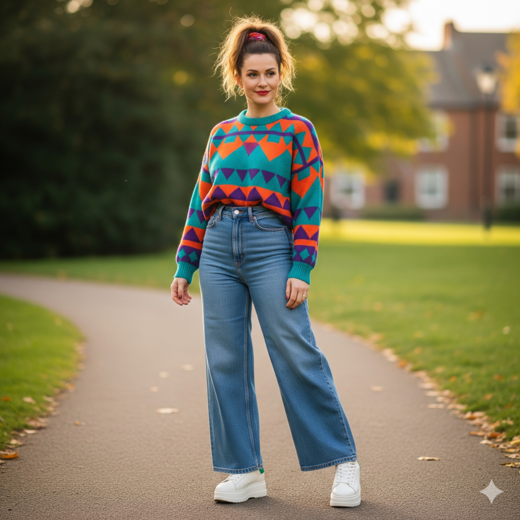 Go for a retro-inspired look by styling your sweater with wide-leg denim and chunky sneakers.