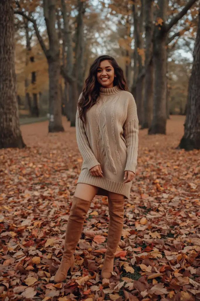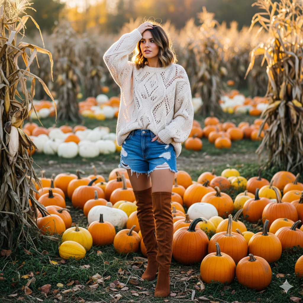 Make it playful by pairing your sweater with denim shorts and thigh-high boots—a fun mix for fall.