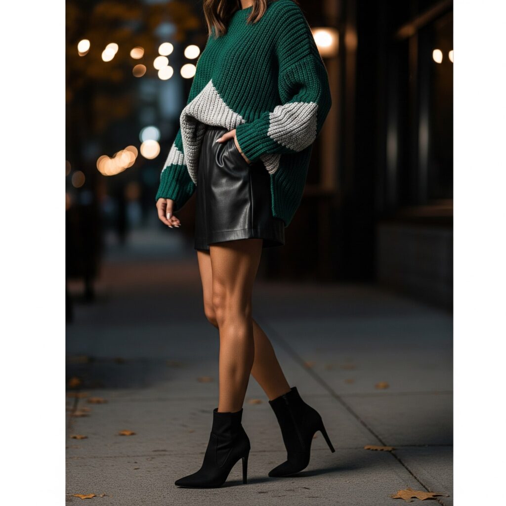 Edge up your oversized knit with a faux leather skirt and sleek ankle boots for a night-ready outfit.