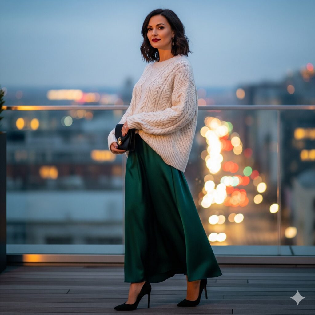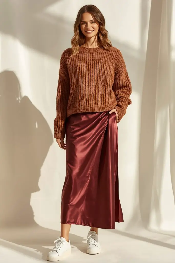 Dress up your sweater with a satin maxi skirt and heels for a classy, elevated look.