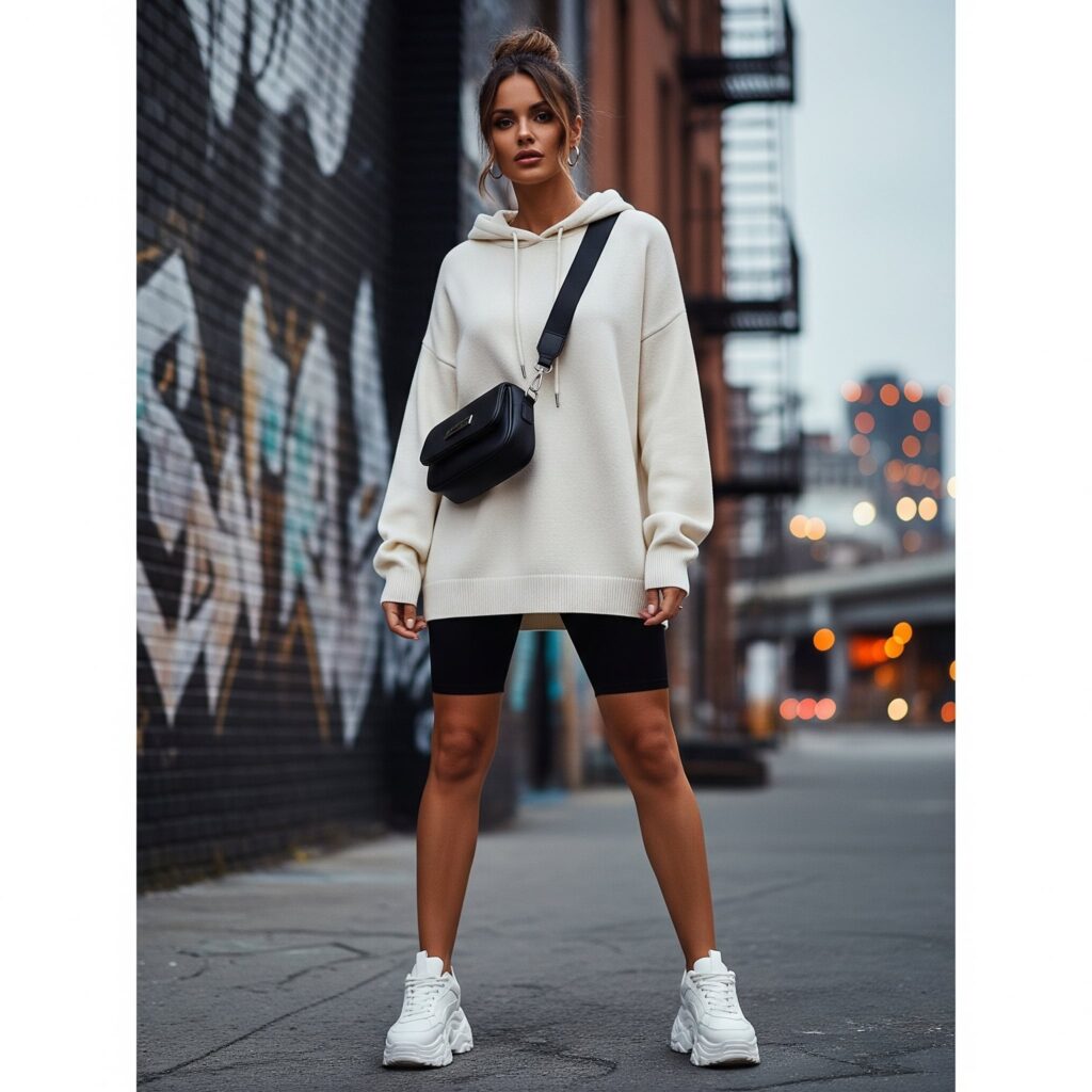 7. Oversized Sweater + Biker Shorts + Chunky Sneakers