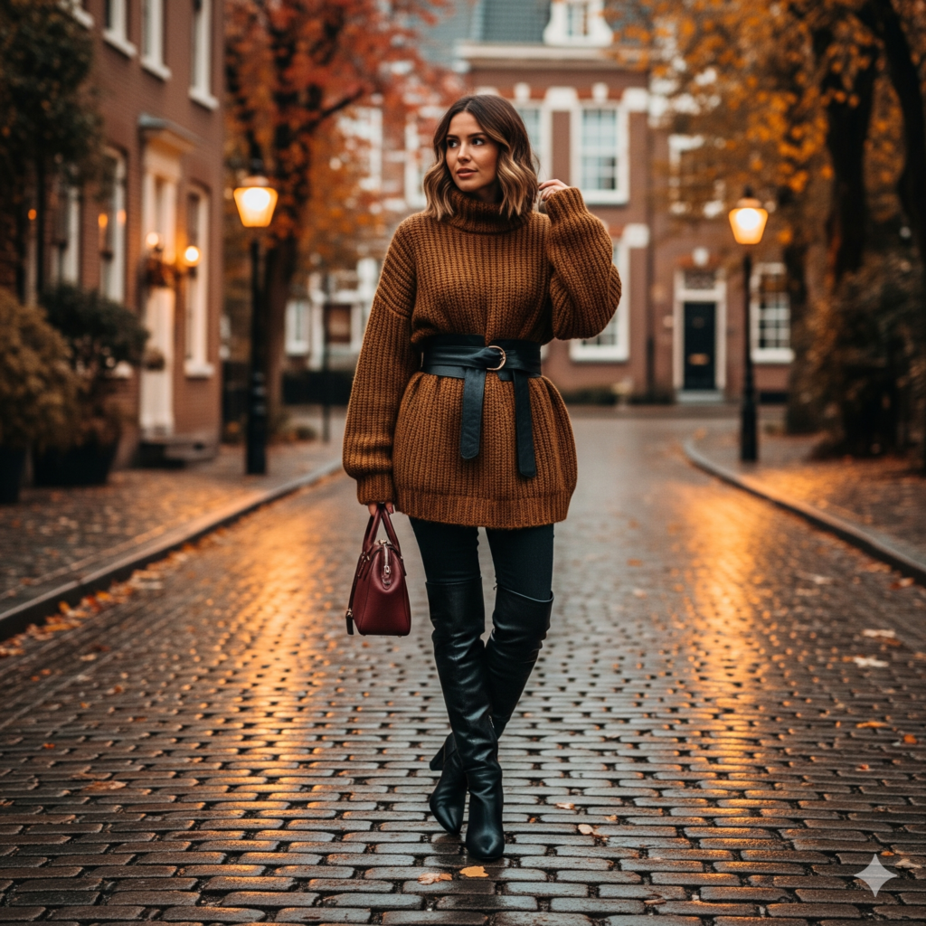 11. Oversized Sweater + Belted Waist + Tall Boots