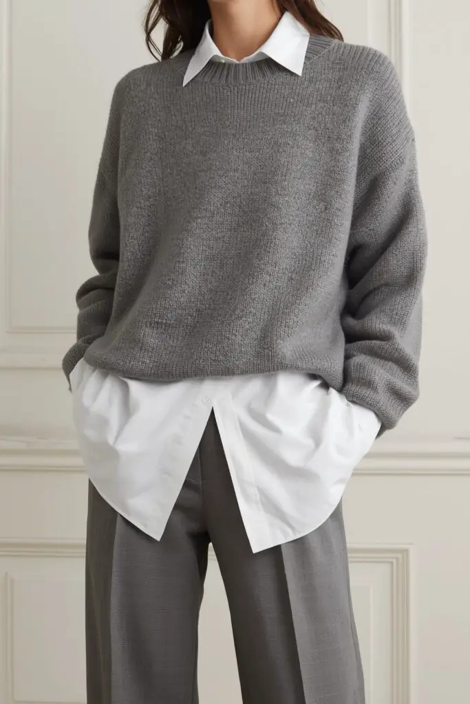 5. Oversized Sweater + Collared Shirt + Wide-Leg Trousers