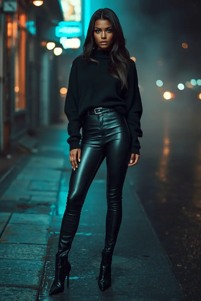 Go edgy with leather leggings and heeled booties, perfect for a casual night out or city stroll.