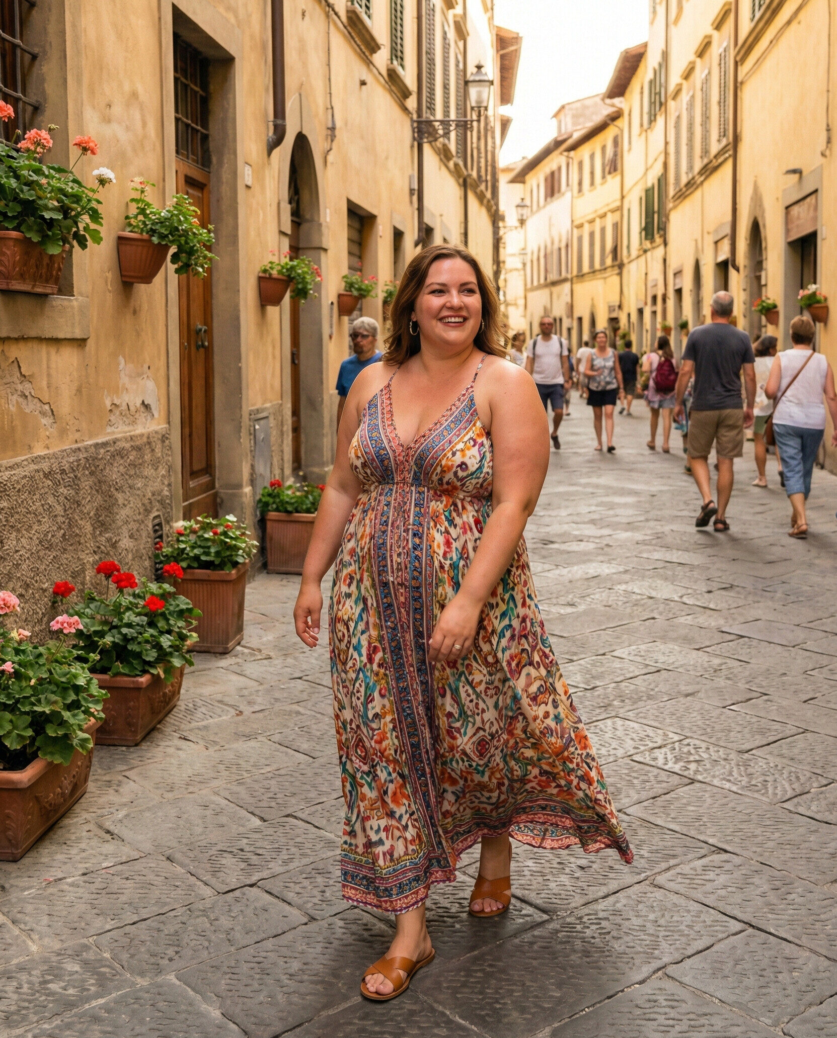 A flowy maxi dress is perfect for summer in Italy, offering breathability and graceful movement. Lightweight fabrics keep you cool during warm days, while flat sandals provide comfort for walking. Choose vibrant colors or floral prints for a cheerful vacation look.