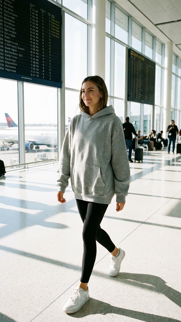 An oversized hoodie paired with leggings is a go-to airport outfit for spring. It offers comfort, warmth, and flexibility for long flights while still looking cute and casual. Sneakers make walking through terminals easy, and the hoodie doubles as a cozy layer when the cabin gets cold.