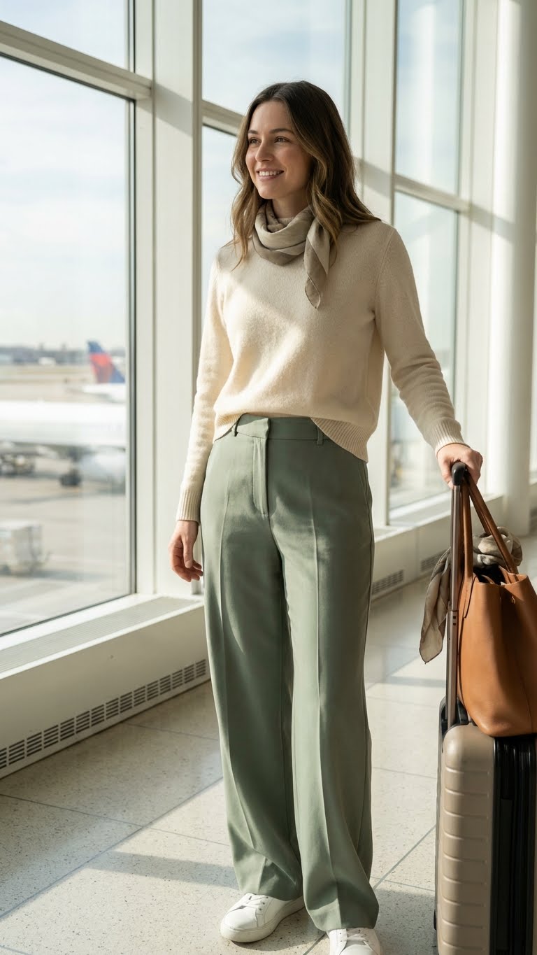 Wide-leg pants offer breathability and comfort, especially for spring travel. Pair them with a lightweight sweater for a polished yet cozy look. This outfit is perfect for travelers who want something more elevated than leggings but still comfortable.