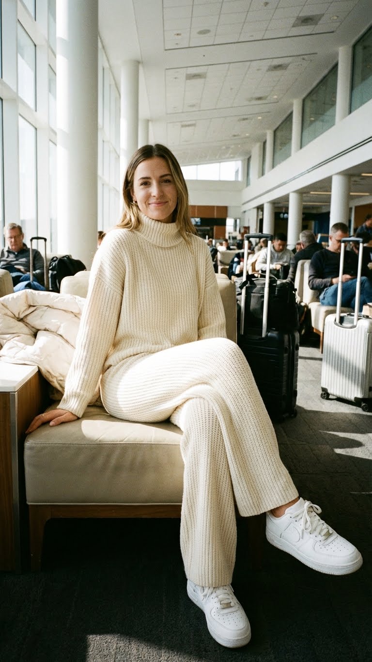 A knit matching set looks stylish and feels soft against the skin. Paired with white sneakers, this outfit is perfect for spring travel. It’s easy to style, comfortable for sitting long hours, and looks polished enough for airport lounges.