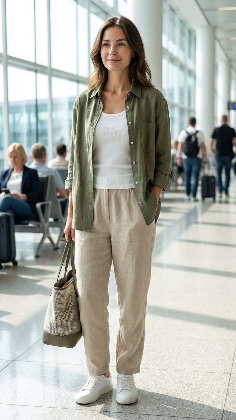 Layering a button-up shirt over a tank top with relaxed pants creates a breathable, stylish airport outfit. The button-up can be worn open or tied for flexibility, making this look ideal for spring travel and changing temperatures.