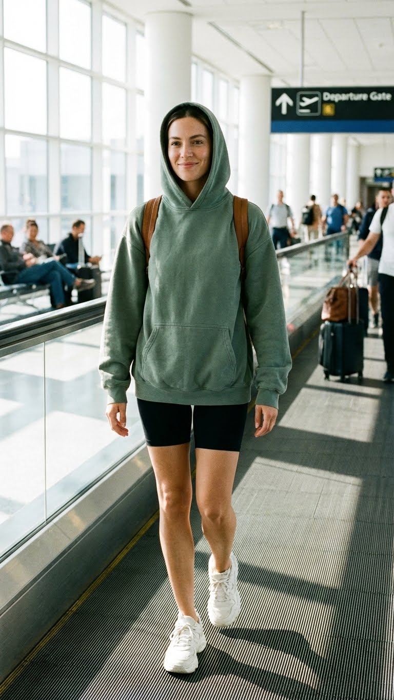 For warmer spring destinations, biker shorts paired with a hoodie offer comfort and mobility. This outfit is great for short flights or travel days where you want to stay cool but still cozy. Sneakers complete the sporty, cute look.