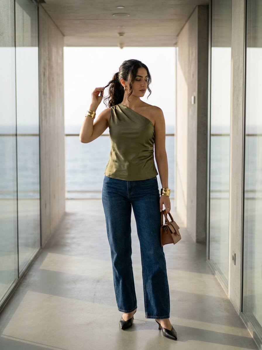 Dark wide-leg jeans meet a one-shoulder satin top for a chic contrast. Style with pointed-toe mules, a boxy top-handle bag, and bold cuffs. This is one of those cute summer looks that feels put-together without trying too hard.