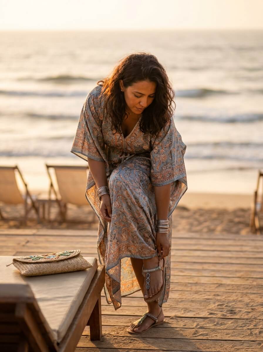 A printed silk kaftan with a cinched waist feels luxe and forgiving after a long day. Style with flat embellished sandals, a statement clutch, and chunky bangles. It’s resort wear that doubles as one of the easiest summer outfit ideas.