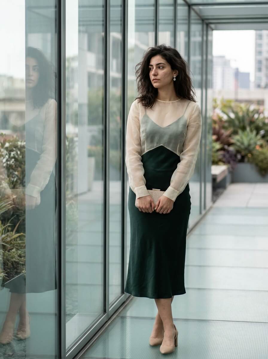 A fitted slip dress layered under a sheer organza overlay creates dimension. Style with minimalist heels, a box clutch, and crystal studs. The unexpected sheer layer adds drama without sacrificing comfort.