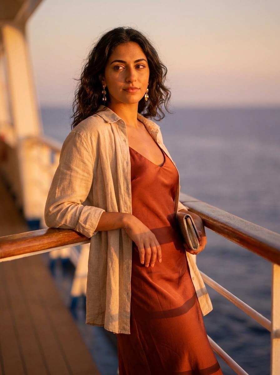 A rust-toned satin slip dress skims the body without clinging. Pair it with delicate strappy heels, a mini metallic clutch, and sculptural gold earrings. Add a lightweight linen shirt worn open for a breezy layer—perfect for sunset dinners on deck.