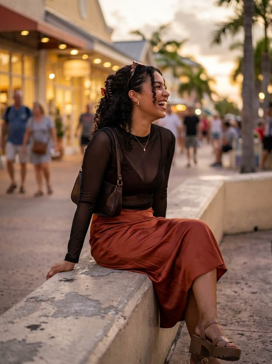 A fitted mesh top layered over a bralette with a satin midi skirt brings subtle nostalgia. Add platform sandals, a mini shoulder bag, and glossy hair clips. This look adds personality while still fitting the cruise dinner vibe.