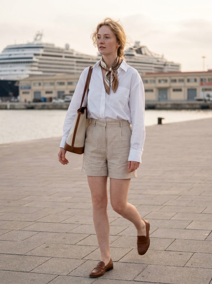 A crisp oversized button-down tucked into high-waisted tailored shorts feels polished yet relaxed. Finish with leather loafers, a structured tote, and a silk scarf tied at the neck. This is effortless coastal style done right for early evening dining.