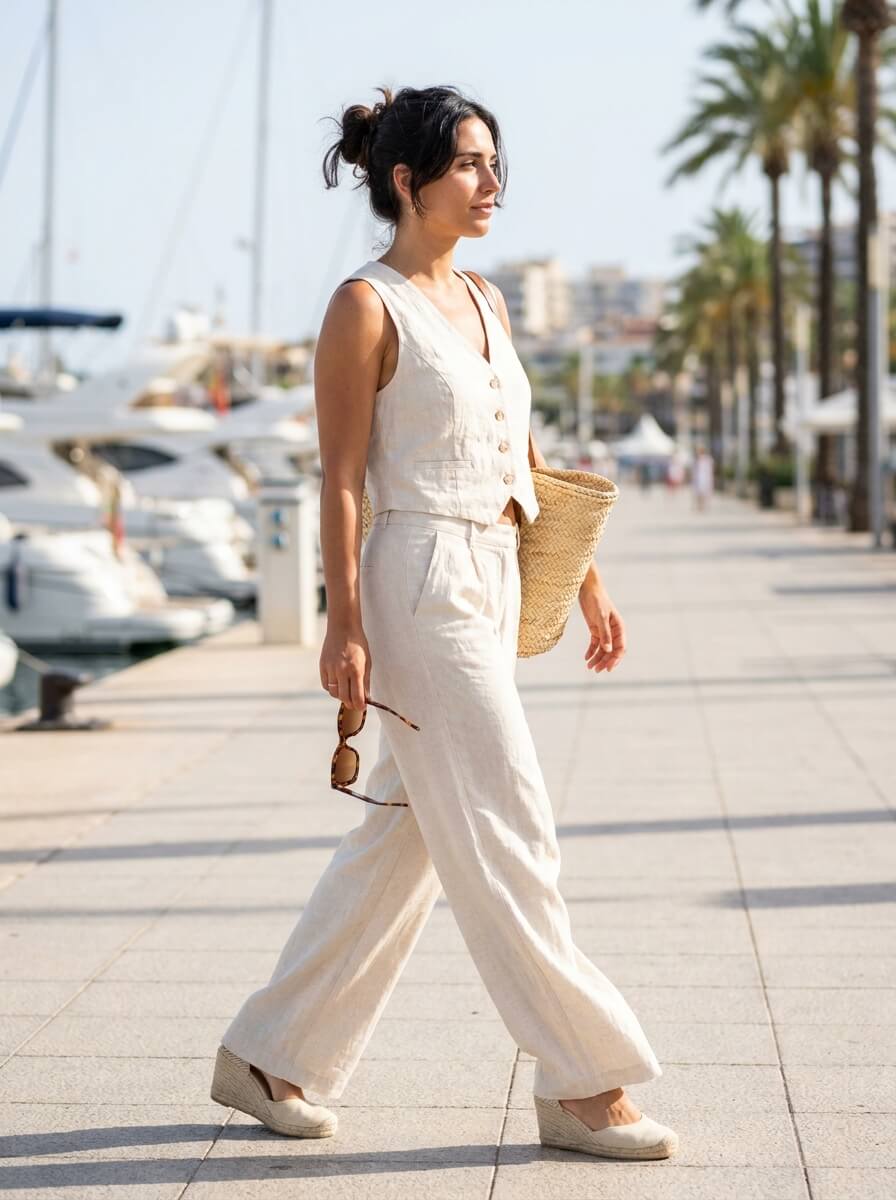 A cream linen co-ord set—cropped vest and flowy trousers—keeps things cool and sharp. Pair with espadrille wedges, a straw handbag, and oversized sunglasses worn into the evening. Minimal effort, maximum impact for warm cruise nights.