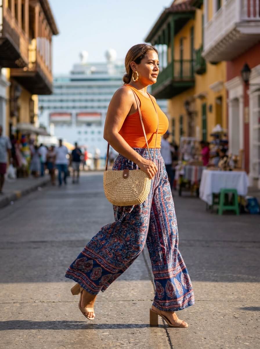 A fitted ribbed tank in a bold hue pairs with flowy printed palazzo pants. Add block heels, a woven crossbody bag, and oversized hoops. It’s vibrant, breathable, and ideal for relaxed yet stylish cruise dinners.