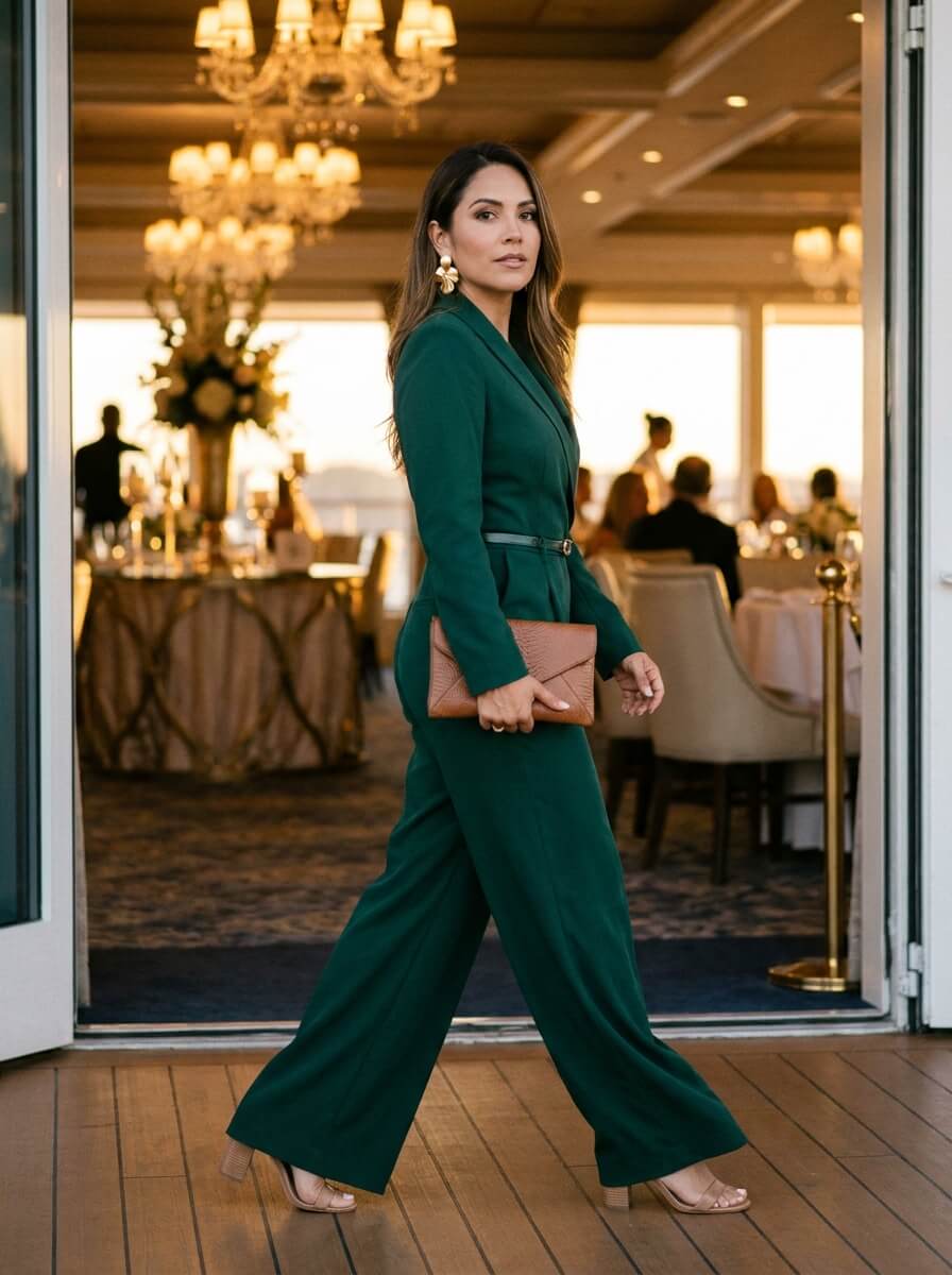 A tailored wide-leg jumpsuit in deep emerald instantly elevates your look. Pair with heeled sandals, a clutch with texture, and bold earrings. Add a slim belt to break the silhouette—perfect for more upscale dining nights onboard.