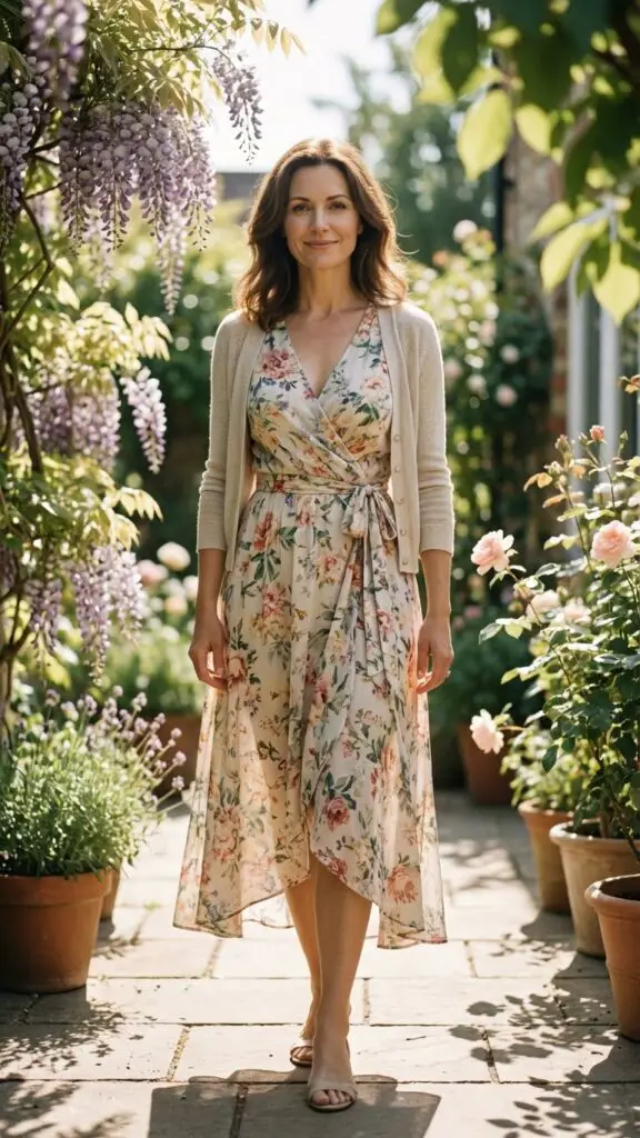 2. Floral Wrap Dress + Lightweight Cardigan