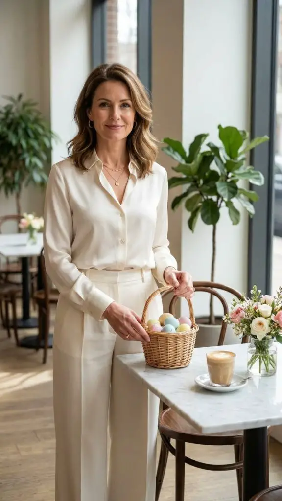 For a chic and elevated look, pair an ivory blouse with tailored trousers. The crisp white top brightens the face, while the trousers offer structure and refinement. This outfit is great for women who prefer polished ensembles that feel sophisticated yet comfortable for Easter gatherings.