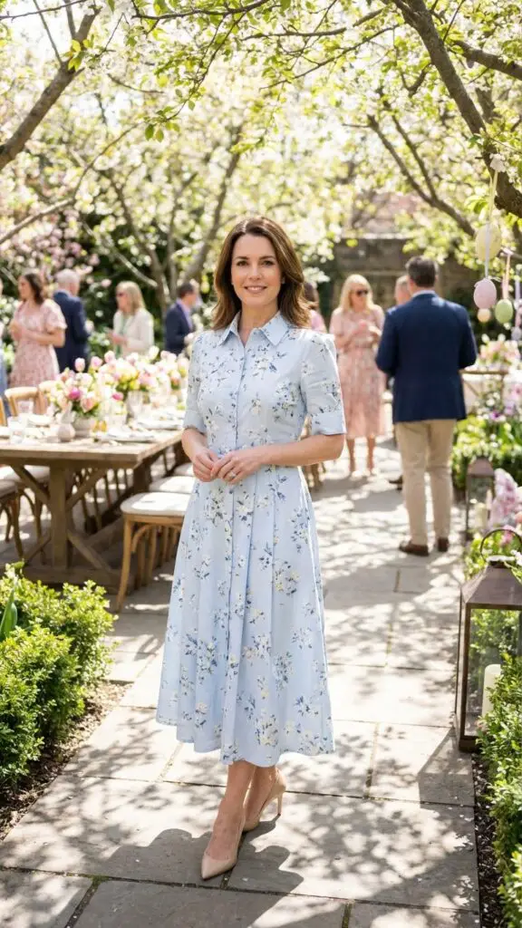 A pastel midi dress is a classic choice for women over 40 because it offers elegance, movement, and modest coverage without feeling heavy. The soft tones—lavender, peach, mint, or robin’s egg blue—capture Easter’s fresh, uplifting spirit. Pair it with neutral heels to keep the look polished and timeless.