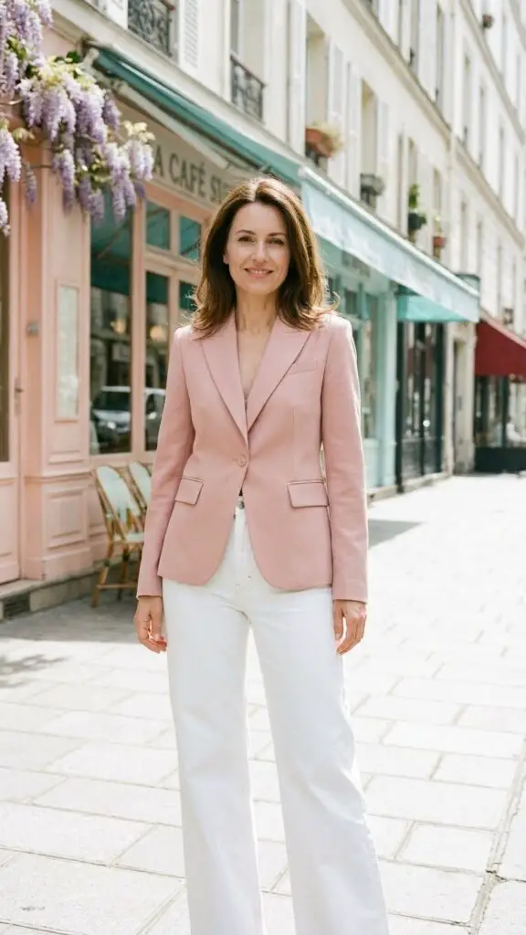 A blush pink blazer instantly elevates your outfit while staying soft and spring-inspired. Pair it with white jeans for a clean, refreshing look. This outfit is ideal for women over 40 who want something modern, polished, and versatile enough for various Easter plans.