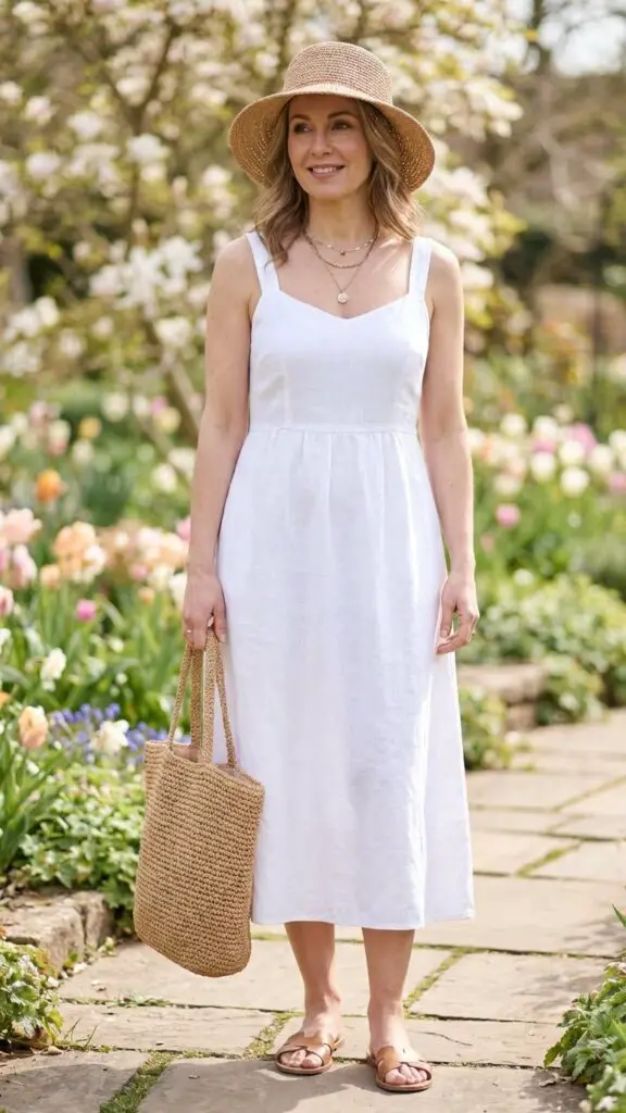 A white midi dress offers crisp simplicity that’s especially flattering on women over 40. Adding woven accessories such as a straw bag or textured belt brings warmth and dimension to the outfit. This is a perfect option for sunny Easter events or outdoor brunches.