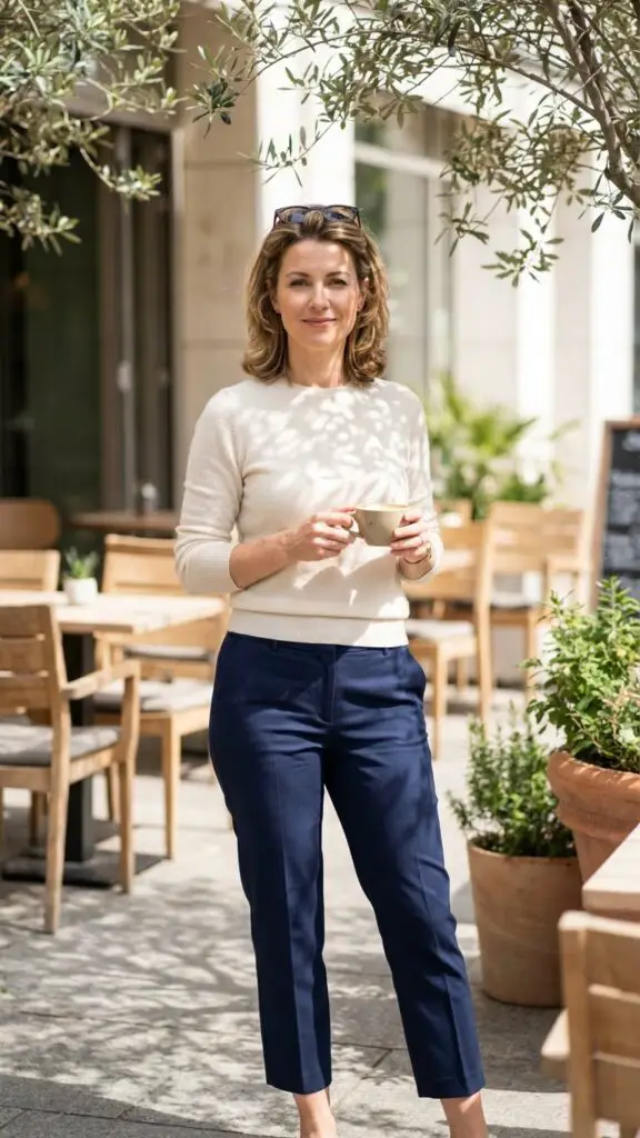 A soft knit top paired with cropped tailored pants is a comfortable yet polished look ideal for Easter activities. The cropped pants show off your footwear, while the knit adds texture and softness. This outfit feels modern and age-appropriate without sacrificing style.