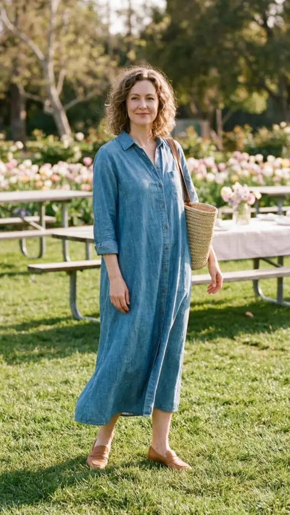 A chambray shirt dress is effortlessly stylish and flattering on mature figures. The breathable fabric makes it perfect for warmer spring days, while the relaxed fit keeps it comfortable for long family events. Tan flats add a sophisticated, neutral finish that complements the dress perfectly.