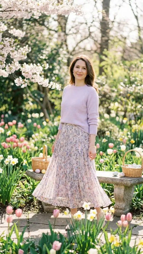 A lightweight sweater tucked into a pleated midi skirt creates a classy, feminine look. The pleats add movement and elegance, while the sweater keeps things cozy without appearing too casual. This combination works beautifully for Easter brunch or outdoor celebrations where comfort and style are both important.