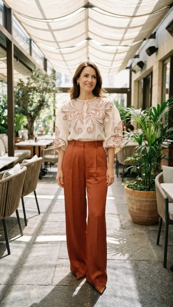 A statement blouse—think soft ruffles, delicate prints, or subtle shimmer—paired with wide-leg pants creates an effortlessly chic silhouette. This look is perfect for women over 40 who enjoy elegant, standout pieces without going over the top.