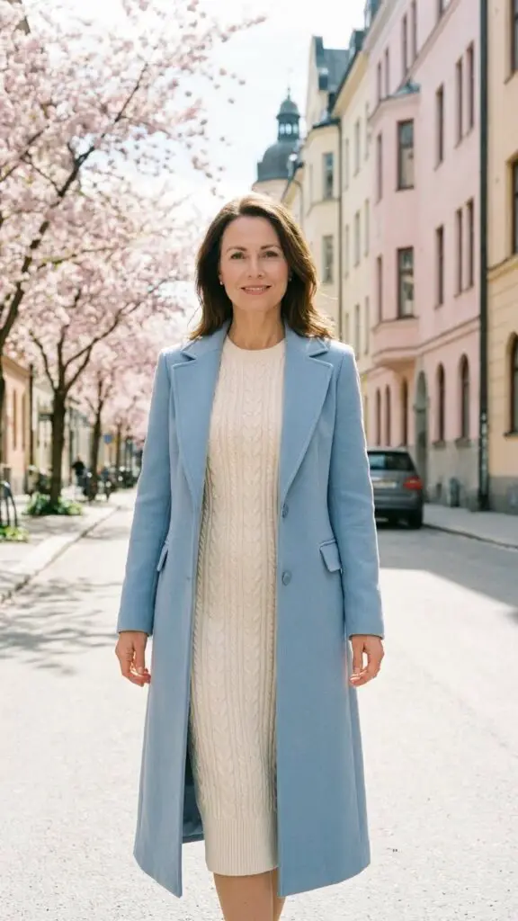 A knit dress provides comfort and shape, while a longline coat adds refinement and warmth. This combination offers a mature, sophisticated Easter outfit that transitions beautifully from chilly mornings to warmer afternoons.