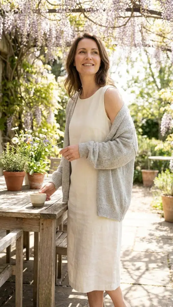 Layering a soft cardigan over a sleeveless midi dress creates a gentle, flattering ensemble. The cardigan offers coverage and comfort, while the dress keeps the outfit light and elegant. This is perfect for church services or family gatherings.
