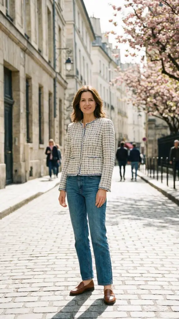 A tweed jacket adds instant sophistication to a casual base. Worn with straight-leg jeans, this outfit feels modern, polished, and comfortable. It’s ideal for Easter brunches where you want to look refined without wearing a dress.