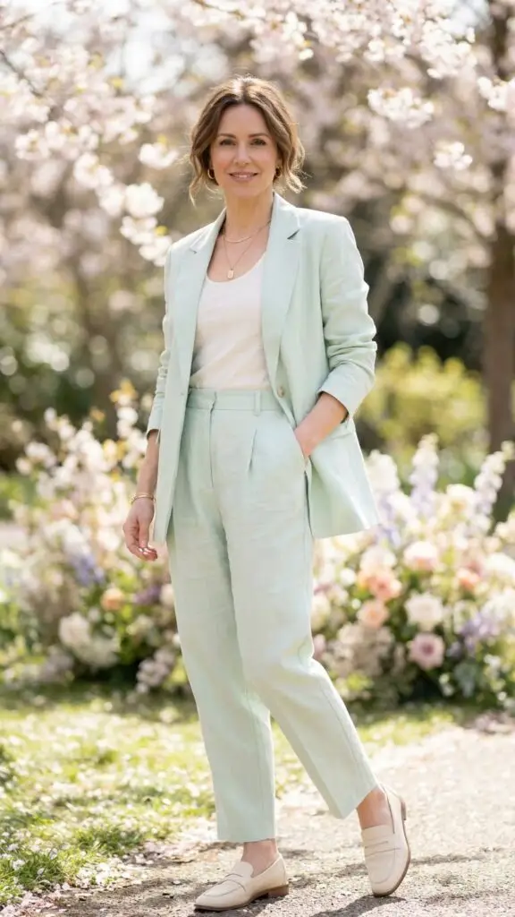 A coordinated pastel set—either skirt and top or trousers and blouse—creates a clean, modern, and effortlessly stylish look. Matching sets require minimal styling while offering maximum polish, making them ideal for women over 40 seeking chic Easter outfits with ease.