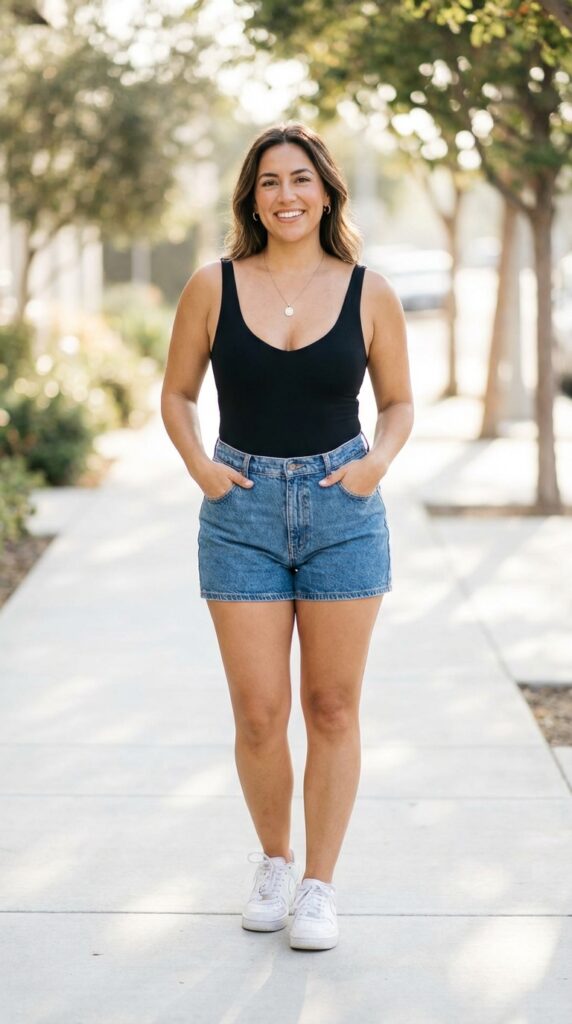 A simple fitted tank top paired with jean shorts creates a clean and minimal summer look. This outfit is perfect for hot days when you want to stay cool without sacrificing style. Add sneakers or sandals and a tote bag for an easy, everyday aesthetic.