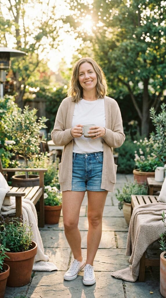 For a soft and cozy touch, layer a lightweight cardigan over a basic top with jean shorts. This outfit is ideal for slightly cooler summer mornings or evenings. Pair with sneakers or flats for a comfortable and aesthetic finish.