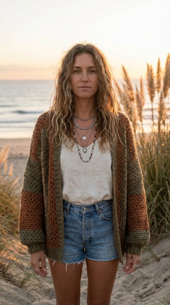 Layer a crochet cardigan over a basic top with jean shorts for a soft, boho-inspired look. The textured fabric adds visual interest while keeping things light. Pair with sandals and layered necklaces for a relaxed summer vibe.