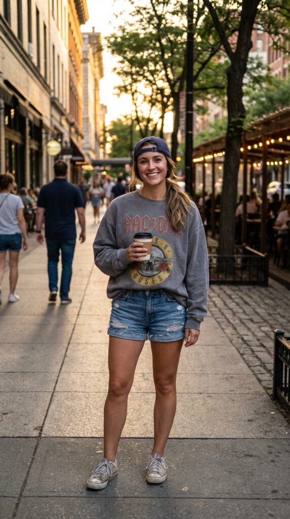 For a cozy-meets-cool vibe, style a lightweight graphic sweatshirt with jean shorts. This outfit is perfect for breezy evenings or casual outings. Add sneakers and a baseball cap for a sporty, laid-back aesthetic.